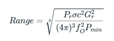 R = ⁴√((Pt × σ × c² × G²) / ((4π)³ × f₀² × Pmín))