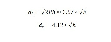 burada h antenin yüksekliğidir (metre cinsinden), d l optik görüş hattı mesafesidir ve d r radyo aralığıdır.